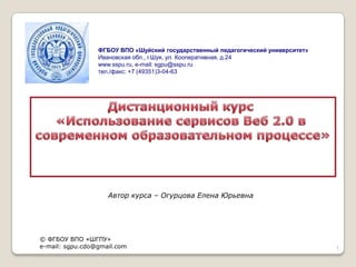 Документ представляет дистанционный курс по использованию веб 2.0 в образовательном процессе, разработанный Огурцовой Еленой Юрьевной из Шуйского государственного педагогического университета. Курс направлен на активизацию взаимодействия между учителями, студентами и родителями с помощью современных сетевых сервисов. Он охватывает вопросы создания тестов, анкет, ментальных карт и других интерактивных средств для улучшения учебной деятельности.