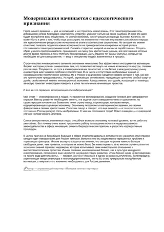 Документ обсуждает необходимость синхронизации технологической модернизации и политической системы в России, с акцентом на работу технопредпринимателей и венчурных инвесторов. Автор подчеркивает важность создания благоприятной среды для разработки и коммерциализации технологий, а также необходимость упрощения бюрократических процедур и привлечения финансирования. В качестве примера позитивных изменений упоминается проект в Сколкове, которому отводится роль инкубатора для инновационной экономики.
