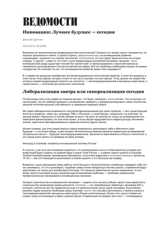 Документ обсуждает необходимость технологической модернизации в России и важность устранения политических и экономических препятствий для инновационного развития. Основное внимание уделяется свободе исследований, развитию технологий и коммерциализации для технопредпринимателей и венчурных инвесторов. Авторы акцентируют внимание на создании благоприятной среды для инвестиций, приведя в пример проект в Сколково, который может стать идеальным стартом для новой экономики.