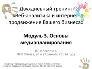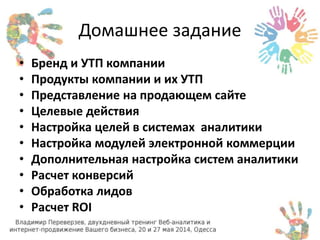 Документ описывает двухдневный тренинг по веб-аналитике и интернет-продвижению, включая основы медиапланирования, механизмы настройки целей в системах аналитики и использование различных каналов продвижения. Рассматриваются принципы работы с семантическим ядром, а также важность UTM-меток для отслеживания эффективности рекламных кампаний. Упоминаются практические задания для участников, направленные на активную работу с рекламными ресурсами и стратегиями продвижения.