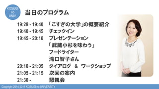 第20回「こすぎの大学」は「武蔵小杉を味わう」と題して、フードライター 滝口智子さんを先生役としてお迎えしました。滝口智子さんの活動や思いをご紹介していただいた後、参加者の方々とダイアログやワークショップを通じて理解を深めました。(2015年4月10日開催)