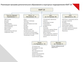 Документ описывает программы дополнительного образования в образовательном учреждении КАиТ-20, включая курсы по веб-дизайну, робототехнике и компьютерным технологиям. Программы аккредитованы и охватывают широкий спектр направлений, предлагая возможность получения международных сертификатов. Также подчеркивается важность практических навыков, таких как разработка веб-сайтов и использование современных технологий.