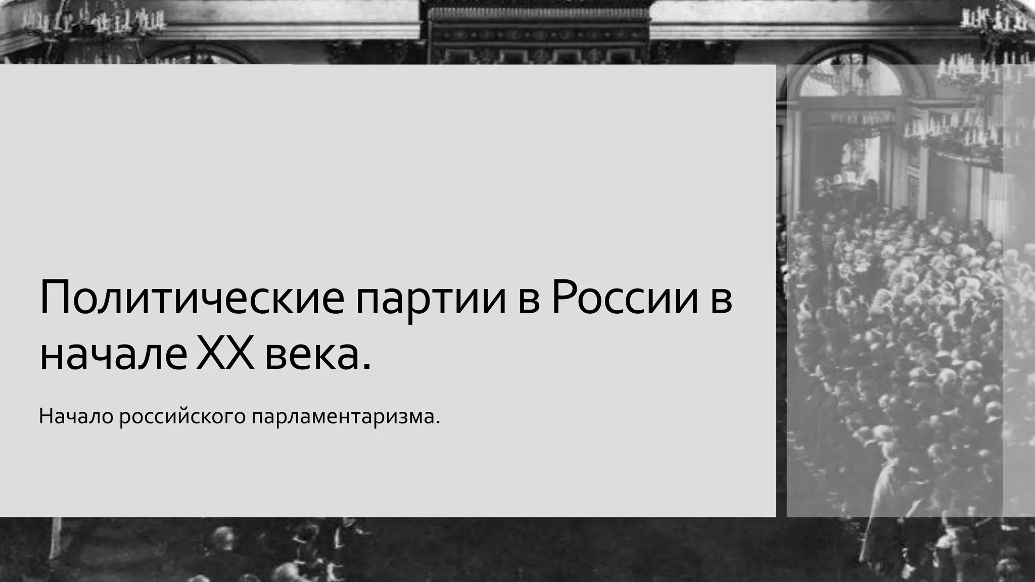 Документ рассматривает политические партии в России в начале XX века, акцентируя внимание на консервативных, либеральных и социалистических группировках. Упоминаются ключевые партии, их лидеры, социальный состав и программные цели, а также хронология развития парламентаризма в стране. Основное внимание уделяется борьбе за политические права и методы достижения целей этих партий.