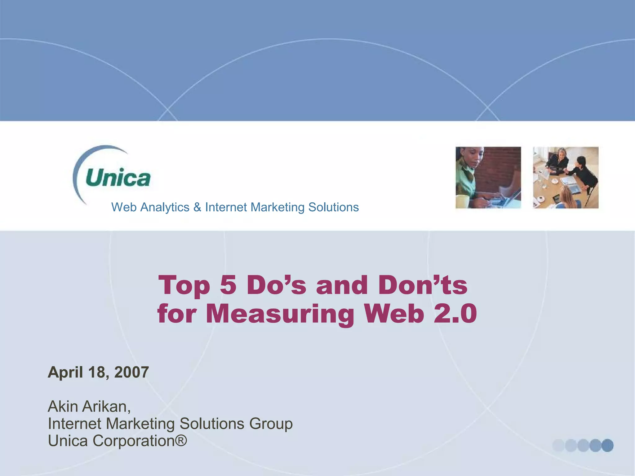 This document discusses best practices for measuring web 2.0 applications and marketing efforts. It recommends measuring engagement, revenue, and social intelligence from web 2.0 sites. It also recommends measuring both online and offline effects of marketing by tracking individual customers across channels to measure lifts from online to offline conversions. The document provides examples and case studies of measuring key metrics for web 2.0 sites and marketing campaigns.