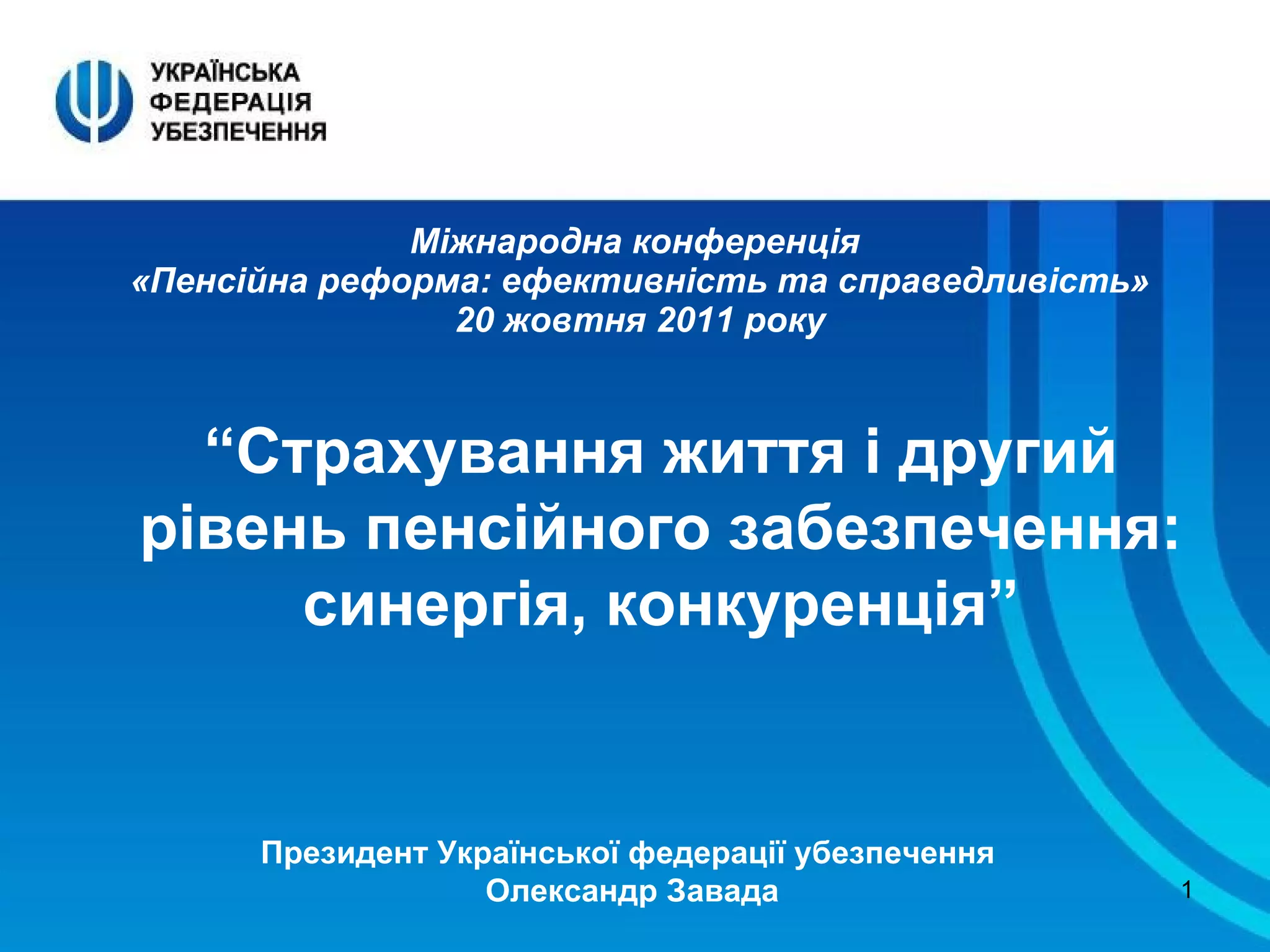 Міжнародна конференція «Пенсійна реформа: ефективність та справедливість» 20 жовтня 2011 року Президент Української федерації убезпечення Олександр Завада “ Страхування життя і другий рівень пенсійного забезпечення: синергія, конкуренція”