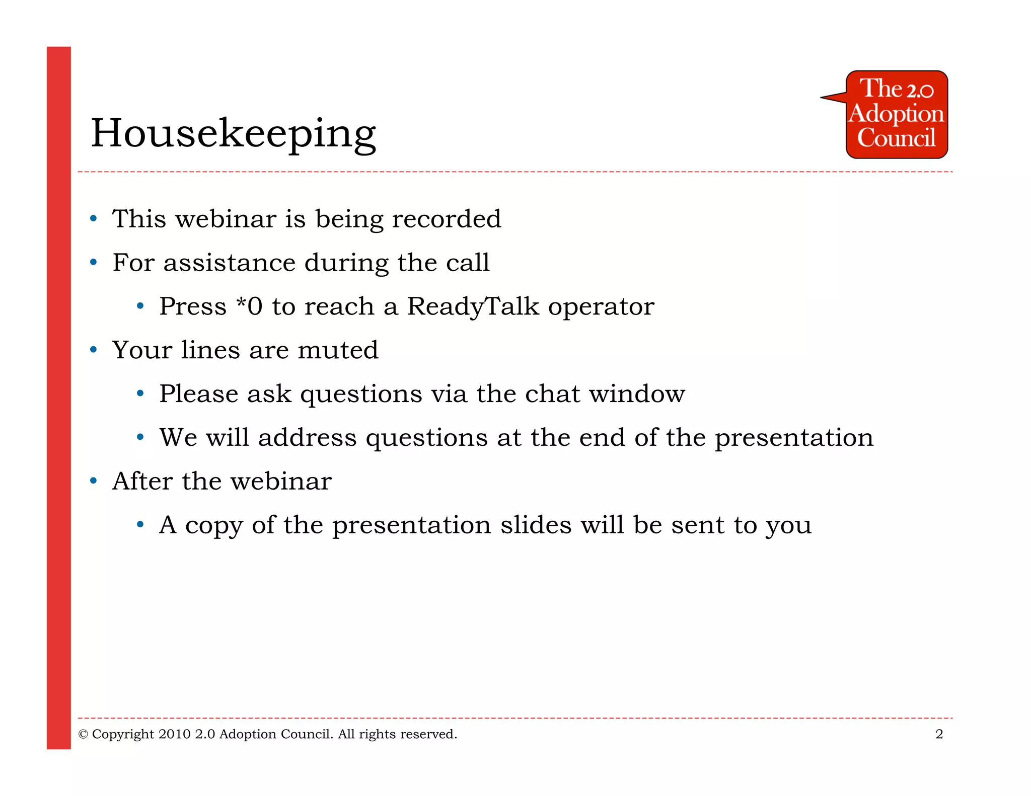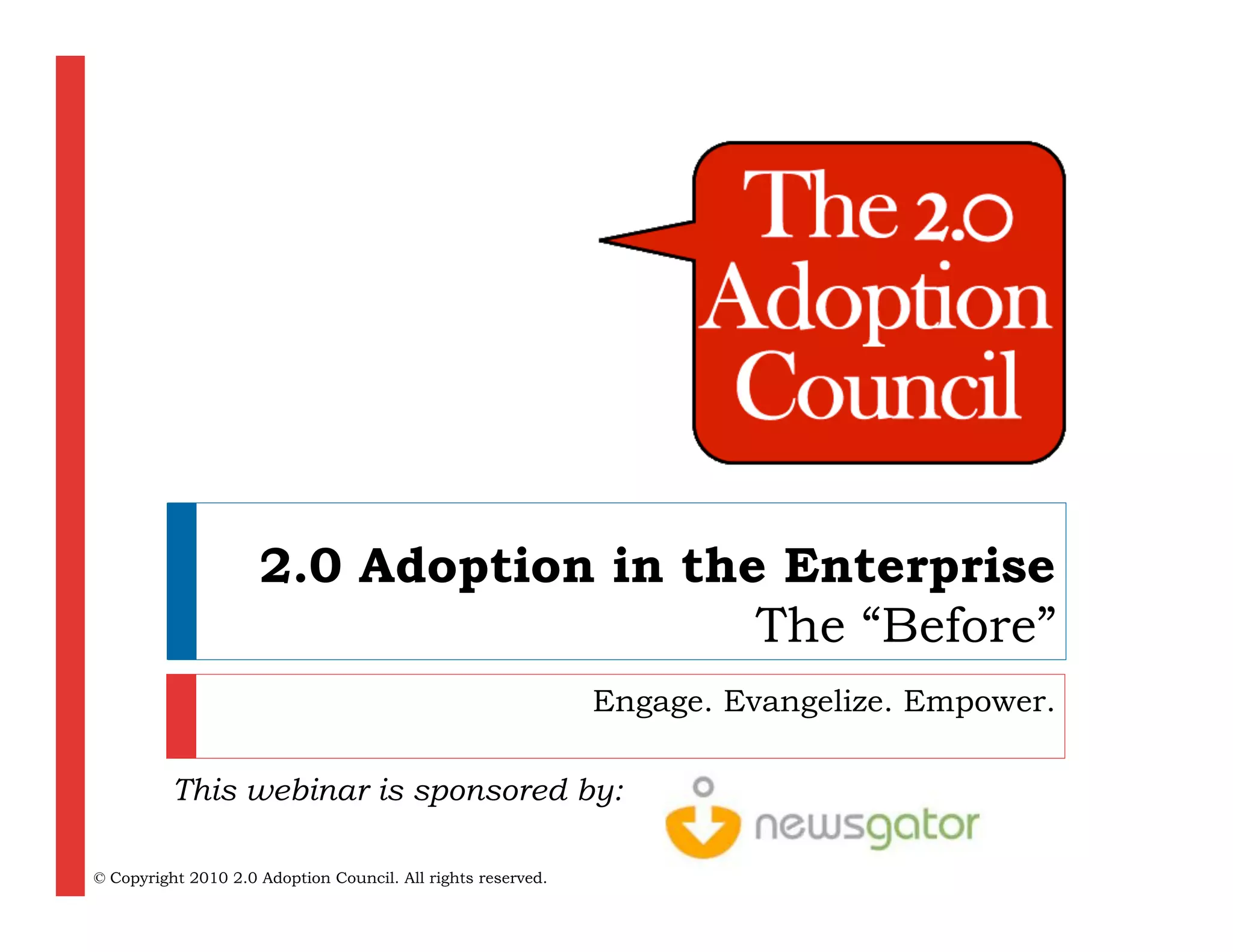 This document outlines a webinar series by the 2.0 Adoption Council focusing on strategies for adopting social computing in enterprises. It includes sessions on developing business cases, implementation best practices, and case studies from organizations like EMC and Raytheon. The agenda emphasizes the significance of change management, executive sponsorship, and measuring success in the adoption process.