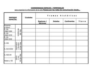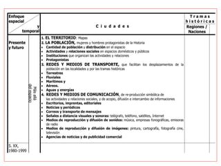 20 ANYS D’INNOVACIÓDOCENT EN COMUNICACIO Estructura de la web: les coordenades: Espais: de les localitats a les trames històriques Temps: de llarga, mitjana i curta durada D’acord amb l’abast de la expansió de les xarxes i mitjans de comunicació En la història contemporània, d’acord amb el recanvi generacional Camps temàtics , per a elaborar explicacions no-androcèntriques El territori : mapes La població: quantitat y distribució, activitats, relacions socials, organització institucional Els mitjans de transport de cada època a cada espai Els mitjans de comunicació de cada època a cada espai