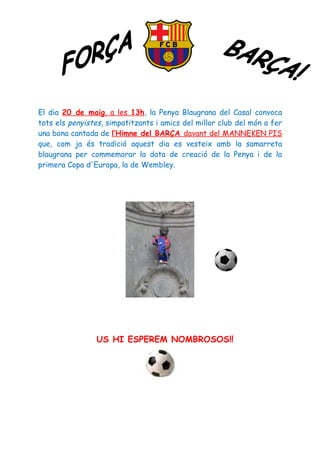 Manneken pis vestit del Barça 1. El dia 20 de maig, a les 13h, la Penya Blaugrana del Casal convoca