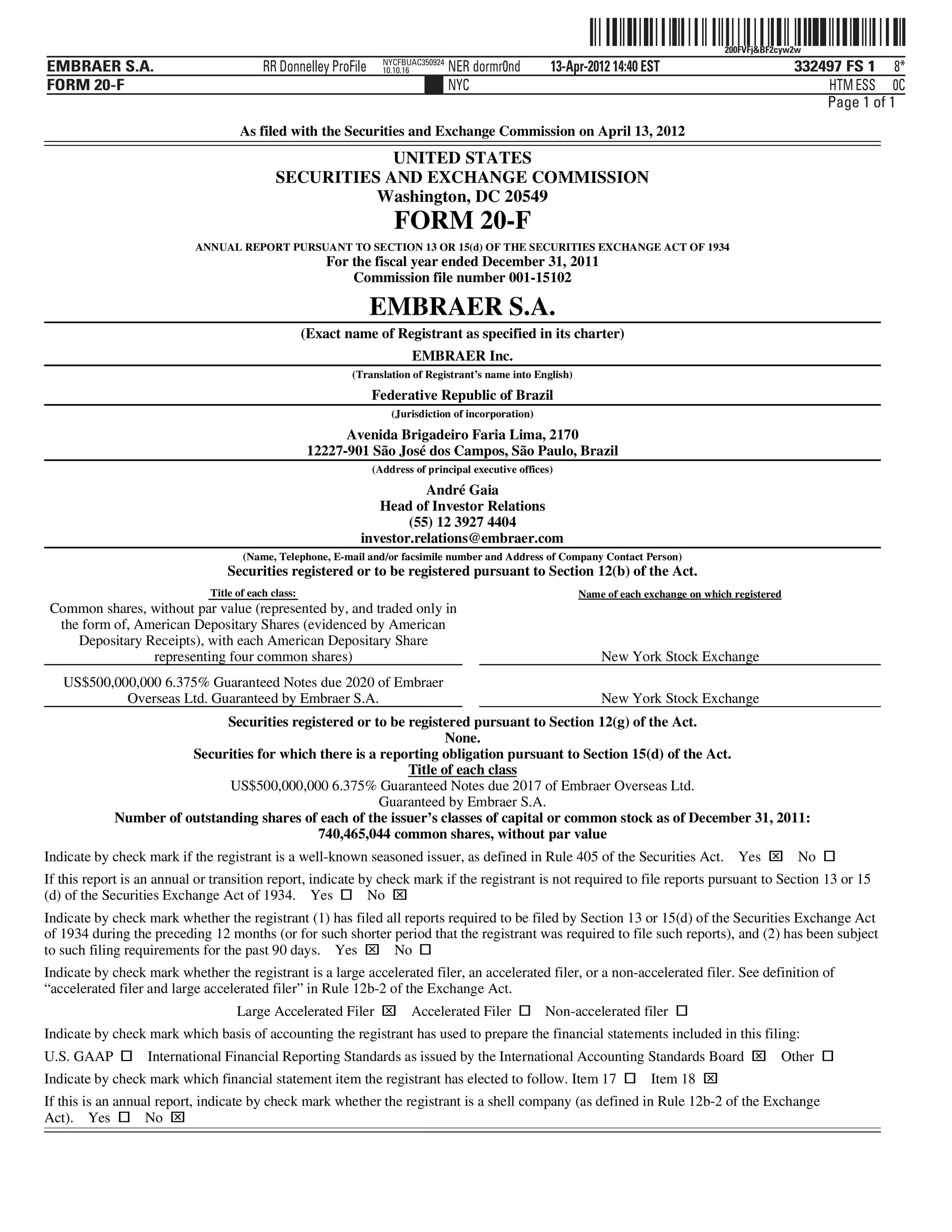 This document is Embraer S.A.'s annual report on Form 20-F filed with the U.S. Securities and Exchange Commission on April 13, 2012. It provides key information on Embraer's financial performance, business operations, directors and management, employees, risks, and other disclosures required for companies registered with the SEC. Specifically, the report discusses Embraer's history, business overview, organizational structure, properties, operating and financial results, research activities, contractual obligations, and corporate governance.