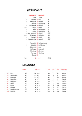 Il documento presenta i voti dei calciatori per la 20° giornata di campionato, con analisi delle prestazioni e punteggi assegnati da vari giocatori. Inoltre, include la classifica attuale con i punti accumulati dai partecipanti. Infine, si notano le performance di calciatori di rilievo come Di Natale e Cavani.