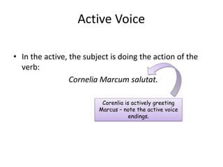 This document discusses deponent verbs in Latin. It begins by explaining that deponent verbs have passive endings but active meanings. It then covers the principal parts, conjugations, present, imperfect, future, perfect system, participles, and passive forms of deponent verbs. Examples are provided throughout to illustrate how to conjugate and translate deponent verbs. Exercises with translations are included at the end. The key aspects are that deponent verbs act similarly to passive verbs in form but have active meanings and translations.