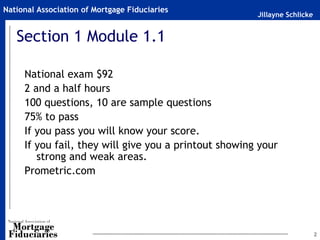 1. The national mortgage licensing exam costs $92, takes 2.5 hours, has 100 multiple choice questions including 10 sample questions, requires a 75% score to pass, and provides feedback on strong and weak areas.