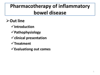 This document provides an overview of the pharmacotherapy of inflammatory bowel disease (IBD) and irritable bowel syndrome (IBS). It defines IBD and IBS, discusses their pathophysiology and clinical presentation. For treatment, it outlines the general approaches including medications used to induce and maintain remission for IBD such as aminosalicylates, corticosteroids, immunosuppressants, antibiotics, biologics and surgery. It also discusses managing IBD complications. For IBS, it discusses treatments based on predominant symptoms including fiber, laxatives, antispasmodics, antidiarrheals, 5-HT3/5-HT4 agents and psychotherapy. The document concludes by evaluating
