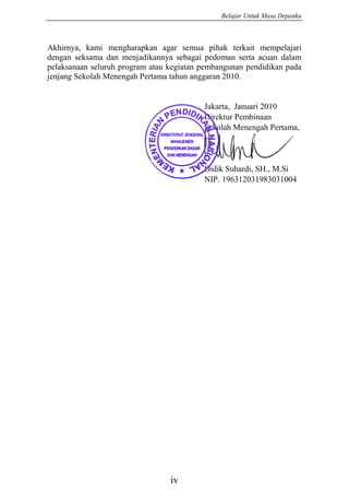 Dokumen ini menjelaskan upaya pemerintah Indonesia dalam meningkatkan mutu pendidikan melalui berbagai kebijakan dan program pendidikan, termasuk penguatan sistem pendidikan dasar dan pengembangan kurikulum di tingkat SMP. Target partisipasi pendidikan telah tercapai dengan angka 98,11% pada akhir 2009, dan terdapat kebutuhan mendesak untuk meningkatkan pengetahuan serta keterampilan Tim Pengembang Kurikulum (TPK) melalui workshop bimbingan teknis. Selain itu, panduan ini juga menyajikan langkah-langkah pelaksanaan bimbingan teknis untuk optimalisasi implementasi kurikulum di seluruh Indonesia.