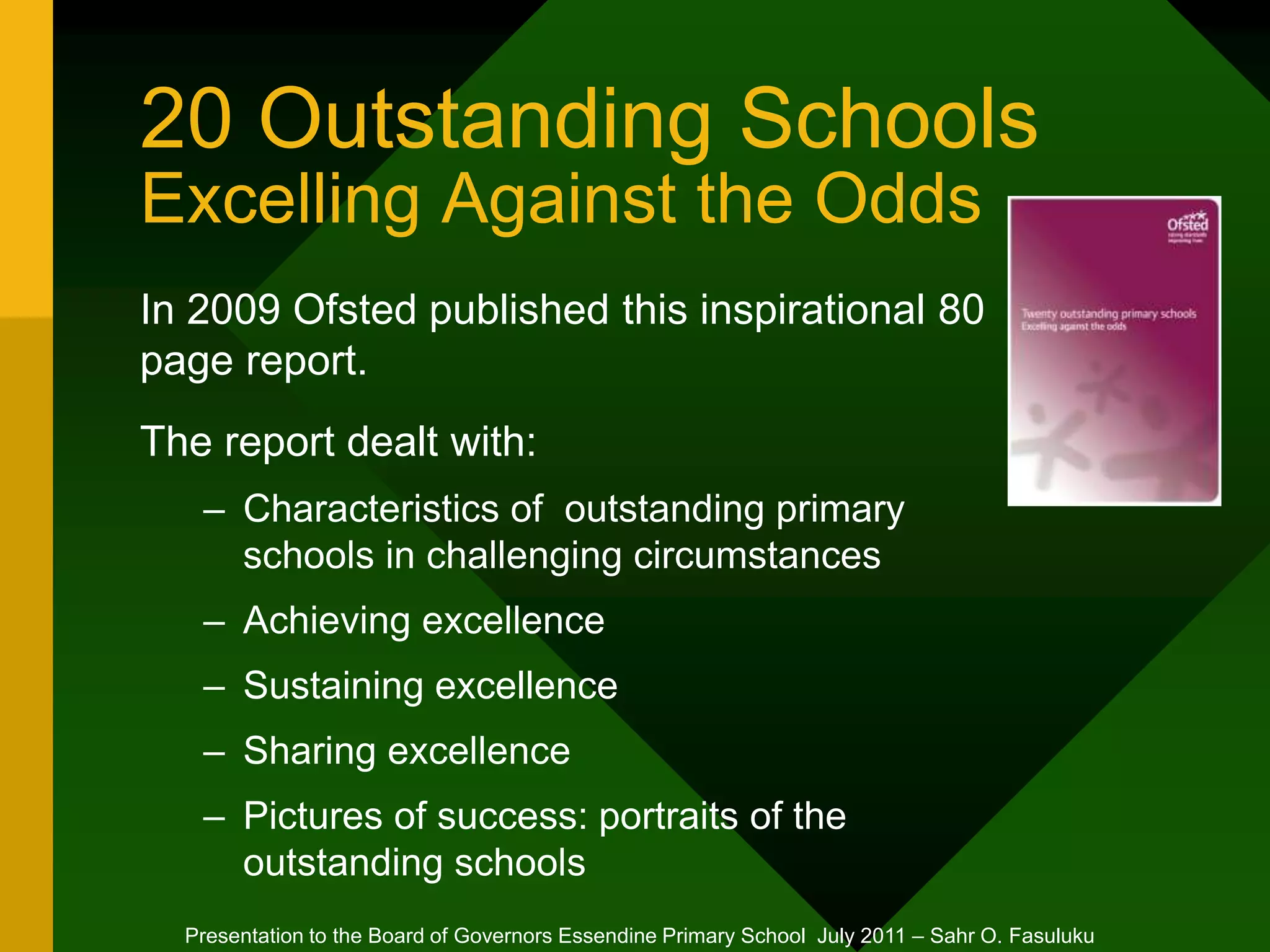 The document summarizes an Ofsted report about 20 primary schools that achieved outstanding ratings despite facing challenging circumstances. It describes the common characteristics that contributed to the schools' success, including high expectations, passionate staff, structured teaching of basic skills, enrichment activities, and involvement of parents and the community. The schools also consistently monitored performance, developed staff, and sustained excellence over time rather than resting on their achievements. Many took on leadership roles to share their best practices with other schools. The presentation recommends that Essendine school incorporate the successful strategies used by the 20 schools.