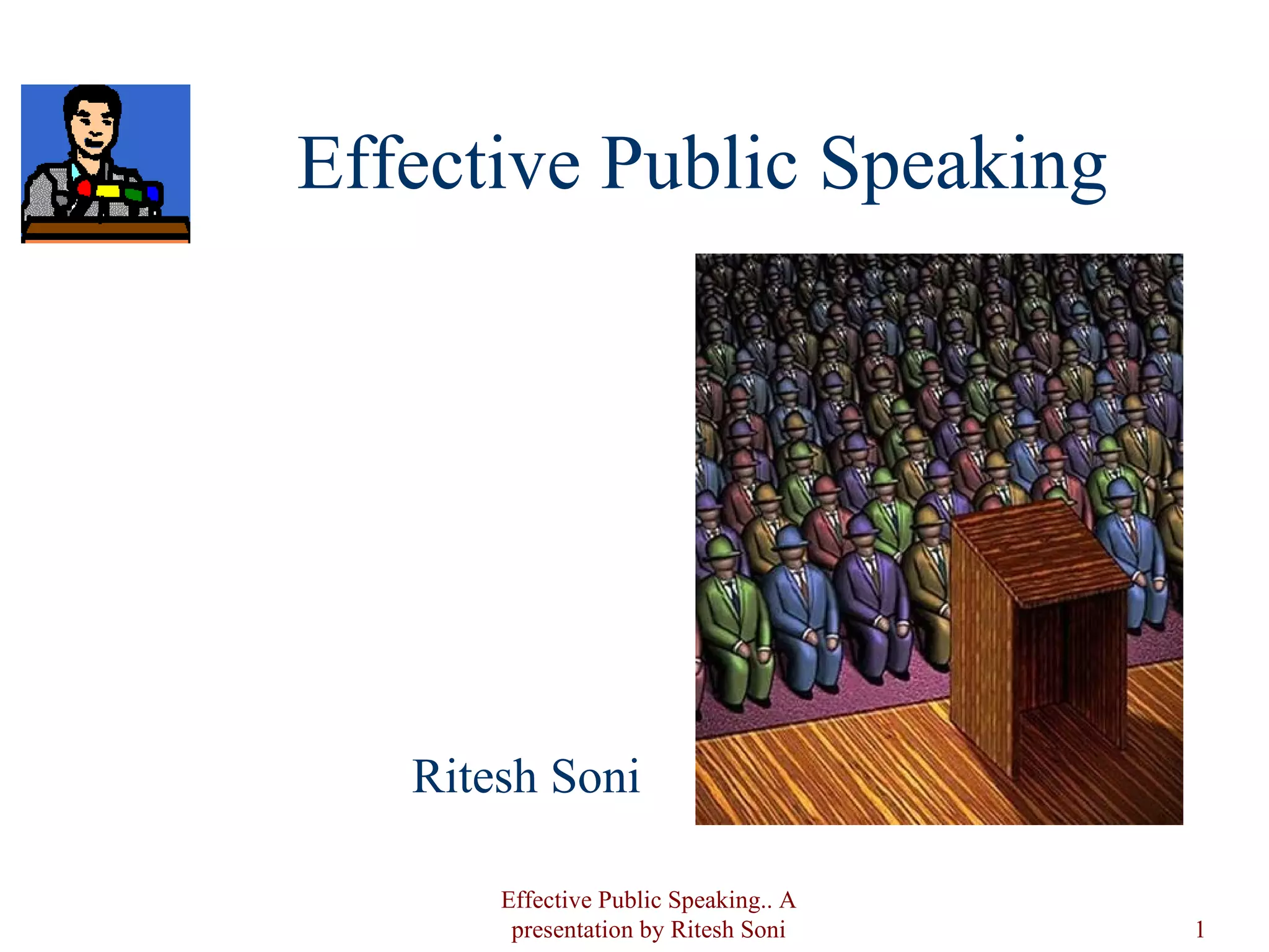 The document discusses effective public speaking skills. It notes that public speaking is one of Americans' top fears and outlines aspects of effective speeches such as thorough preparation, practice, and delivery. Some key points covered include developing an outline with an introduction, body, and conclusion; using visual aids simply; practicing to improve; speaking confidently on familiar topics; and concluding remarks to signal the end.