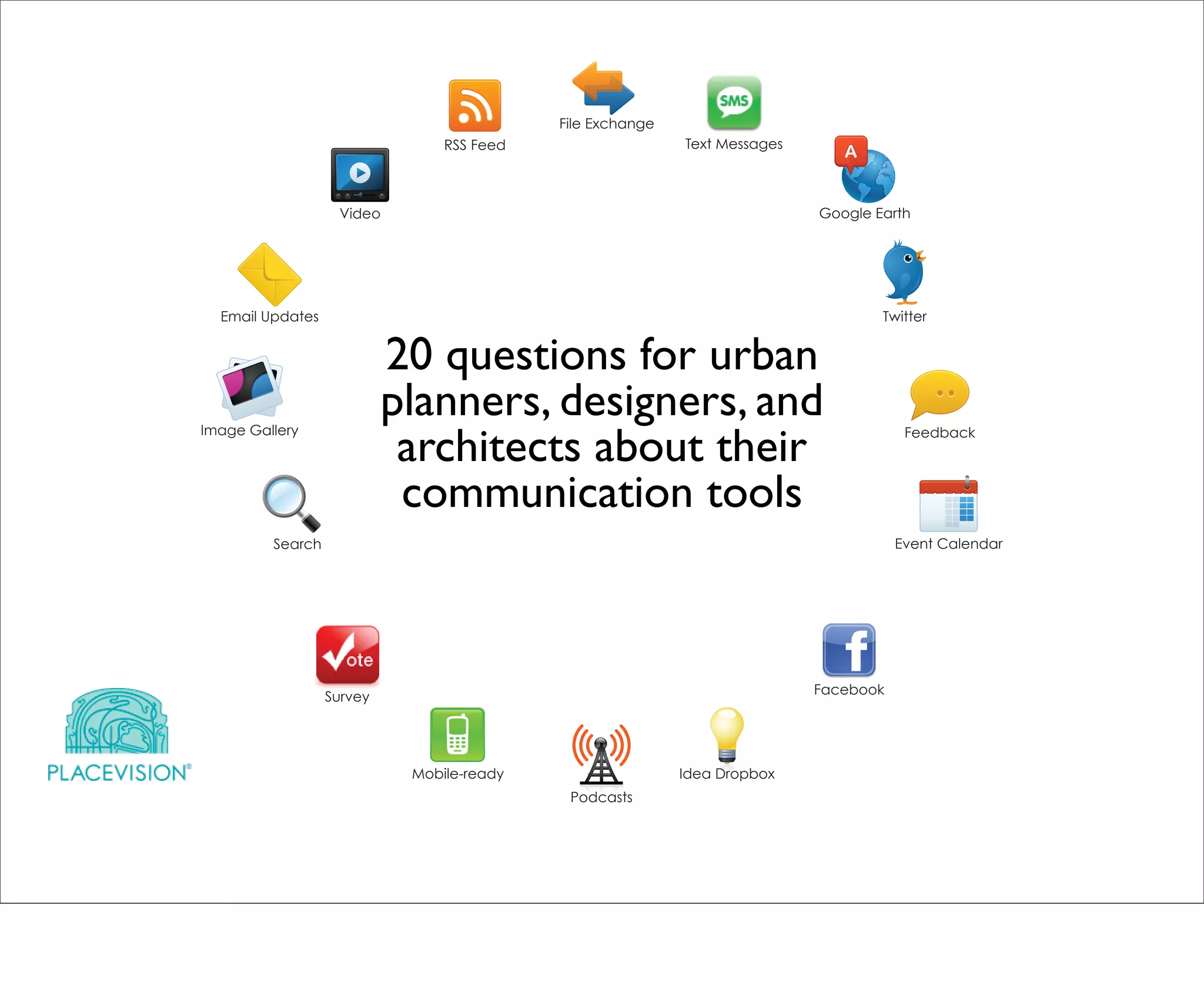 The document discusses various tools and strategies for urban planners and architects to enhance their communication and portfolio management, such as leveraging websites, social media, and mobile technologies. It emphasizes the importance of user-friendly design, citizen engagement through maps and feedback, and the visualization of project data using augmented reality and interactive graphics. Additionally, it highlights the need for measurable goals and return on investment in online activities.