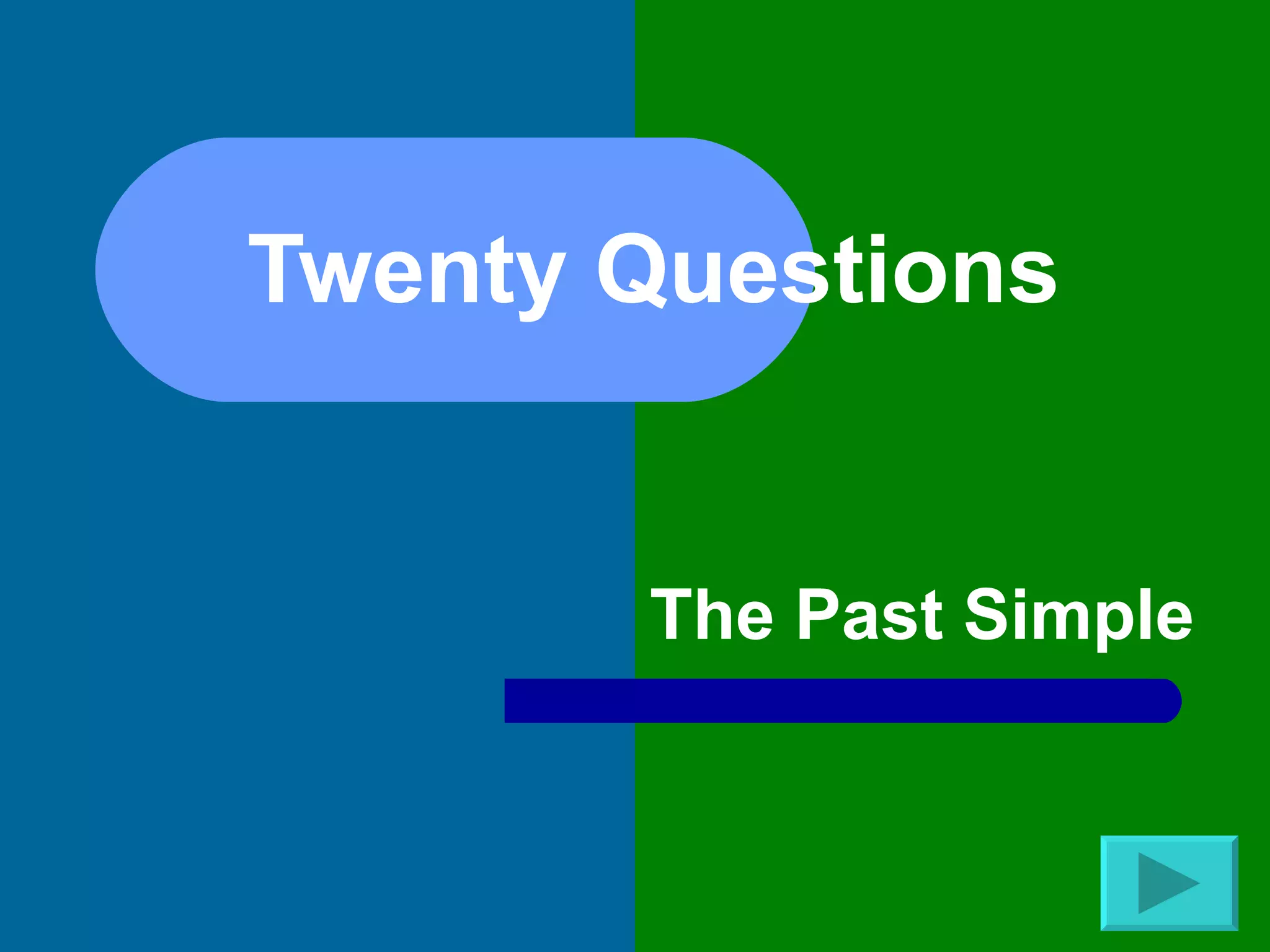The document provides information about the past simple tense in English in 20 questions and answers. Some key points covered include: 1) We double the final consonant and add "ed" to form the past simple of regular verbs, 2) Auxiliary "did" is used to form questions in the past simple, 3) The past simple is used for finished actions in the past.