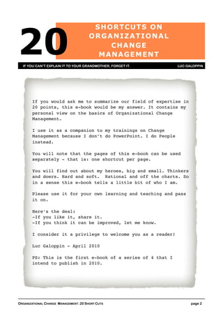 The document is an e-book by Luc Galoppin that outlines 20 key shortcuts in organizational change management, reflecting his personal insights and experiences. It is structured to serve as a guide for training sessions, emphasizing the emotional dimensions of change alongside rational strategies. The content focuses on how to navigate the complexities of change by understanding human emotions and motivations, and encourages readers to embrace these topics in their own teaching and learning.