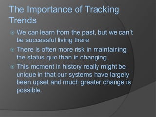 The document outlines 20 sustainability trends from 2010 to 2011, highlighting shifts towards environmentally responsible consumer behavior, increased investment in green technologies, and rising awareness of carbon footprints. It discusses the growing importance of water issues and energy efficiency standards, as well as the rise of 'green' marketing and consumer demand for transparency in environmental claims. The conclusion emphasizes the inevitability of sustainability becoming a central focus in the market, with significant implications for businesses.