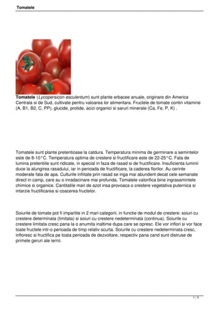 Tomatele sunt plante erbacee anuale originare din America Centrală și de Sud, cu un conținut bogat în vitamine și minerale. Acestea necesită condiții specifice de temperatură și lumină pentru a se dezvolta corespunzător, iar soiurile pot fi clasificate în funcție de modul de creștere. Cultivarea lor implică tehnici de îngrijire și irigare adecvate pentru a asigura producția maximă de fructe.