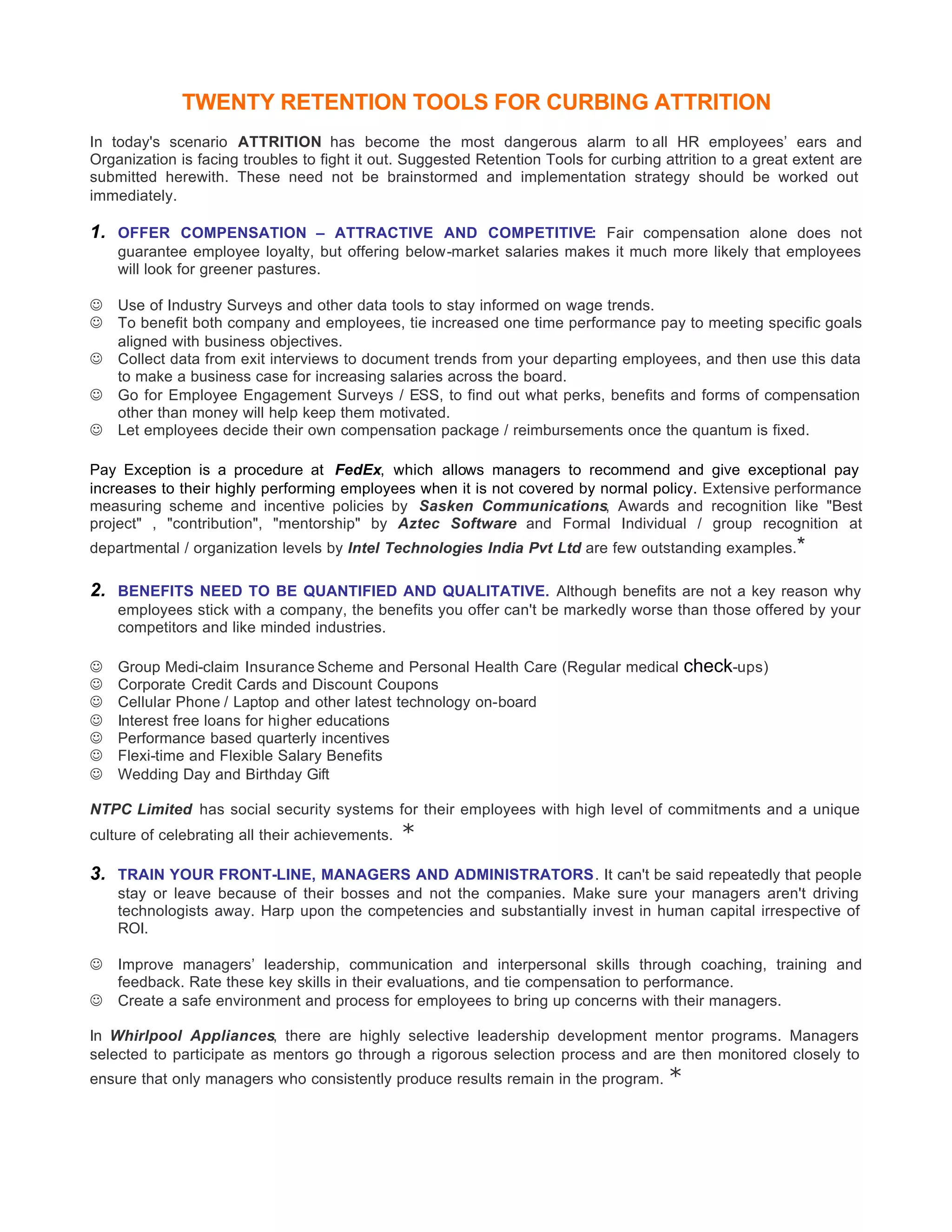 This document provides 20 retention tools for curbing employee attrition. It summarizes each tool with examples of how companies implement them. The tools include offering competitive compensation and benefits, training managers, defining clear roles and responsibilities, providing career progression opportunities, offering retention bonuses for longevity, assigning a process owner for retention strategies, conducting employee engagement surveys, emphasizing teamwork, and becoming a more paperless organization.