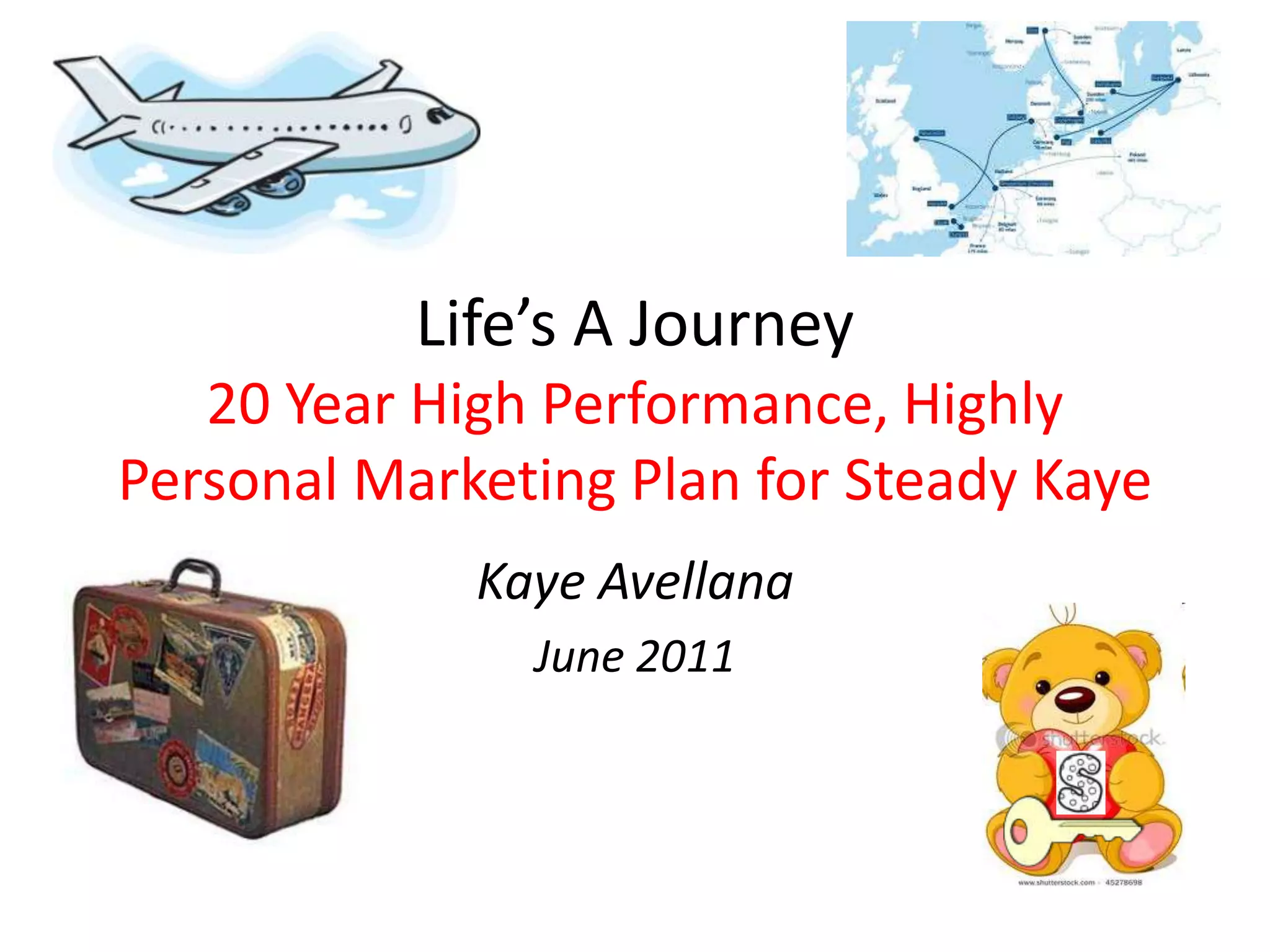 This document outlines Kaye Avellana's 20-year marketing plan for her personal brand "Steady Kaye". The plan details her vision, roles, and brand launch. It includes a 12-point plan, lessons learned from travel, bucket list items, and how she envisions her life in 20 years - from being a student to being married with children and running successful businesses. The plan also describes how she will track her progress through journaling, scheduling, and personal reflection.