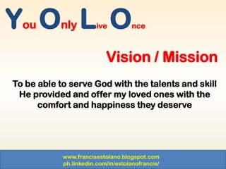 This document outlines Francis Estolano's 20-year personal marketing plan. His vision is to serve God with his talents and provide comfort to his loved ones. Some of his goals are to be a God-fearing Christian, loving family man, caring son, dependable brother, and best friend. He also provides strategies for basketball and questions to guide achieving his career and life goals, which include having a loving family of his own and owning a business in the HR field by age 46.