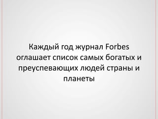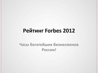 В документе представлен рейтинг Forbes 2012 года, который включает список богатейших бизнесменов России. Первые места занимают Алишер Усманов, Владимир Лисин и Алексей Мордашов. Рейтинг вызывает значительный интерес среди общественности.