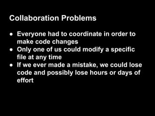 This document discusses using a private Git server and hooks to enable automated software packaging, deployment, testing, and more for a team developing WordPress plugins and themes. It describes problems with previous collaboration and hosting solutions, and how using Git and a self-hosted Git server like Gitosis along with post-receive hooks solves these problems by enabling features like automated packaging into zip files, deployment to servers and S3, unit testing, and more without manual steps.