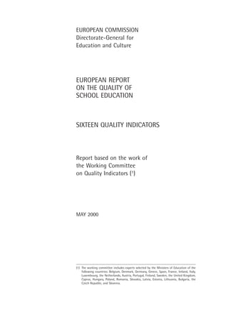 This document presents 16 quality indicators for evaluating school education systems across Europe. It was developed by a working committee of experts from 26 European countries based on a request from education ministers. The indicators cover 4 areas: student attainment levels, educational success and transition rates, monitoring of education quality, and education resources and structures. The goal is to establish benchmarks for comparing best practices and monitoring progress in improving school quality across Europe.