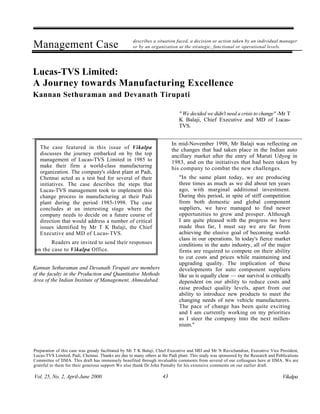 This document provides background information on Lucas-TVS Limited, an automotive components manufacturer in India. It discusses Lucas-TVS' business divisions and facilities. It also provides context on the Indian automotive industry and emerging trends in the automotive components industry. The document then focuses on Lucas-TVS' oldest plant in Padi, Chennai, describing its history and role as a test bed for the company's initiatives to become a world-class manufacturer.