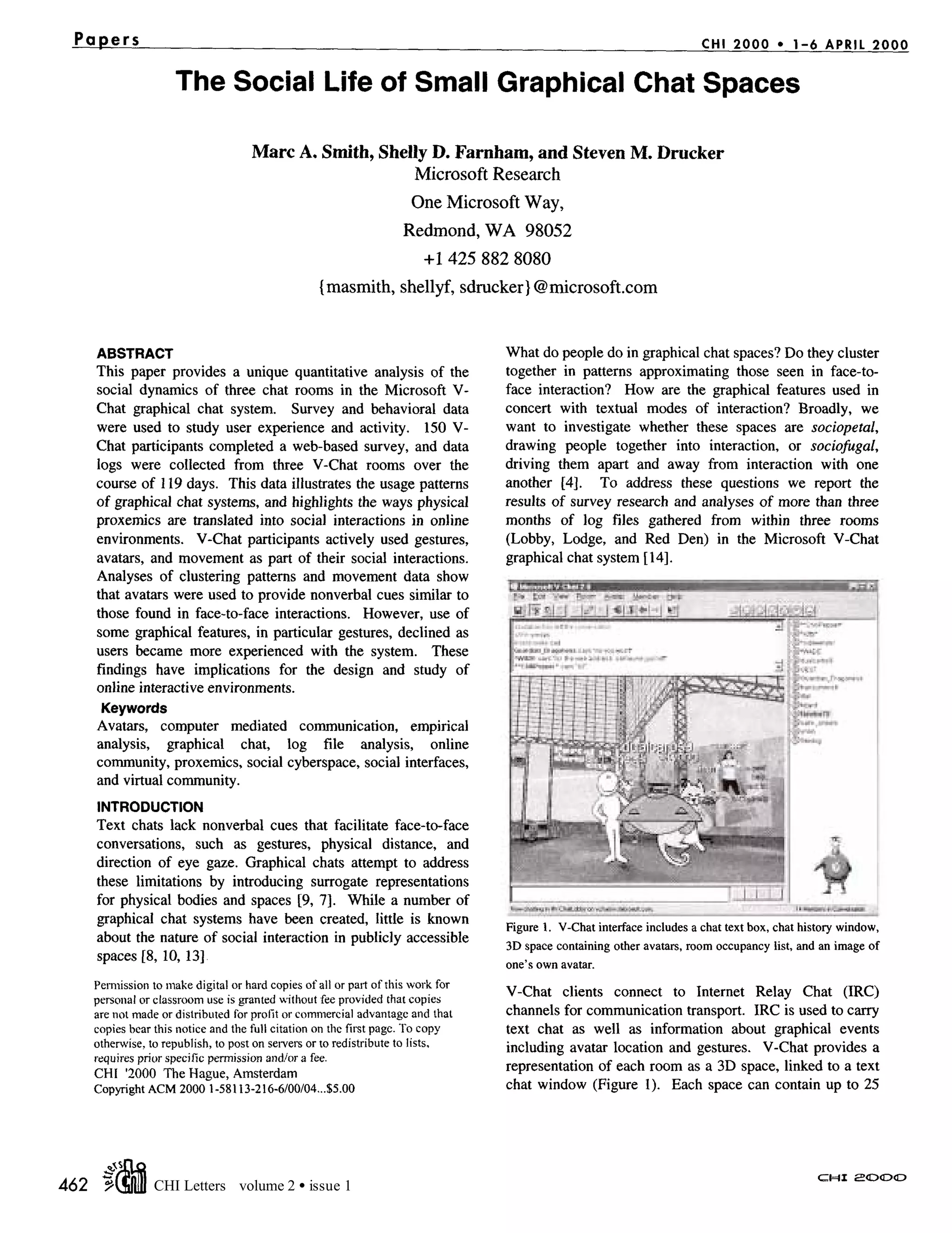 This document analyzes user behavior and social dynamics in three graphical chat rooms in the Microsoft V-Chat system over 119 days. Survey and log data show that: