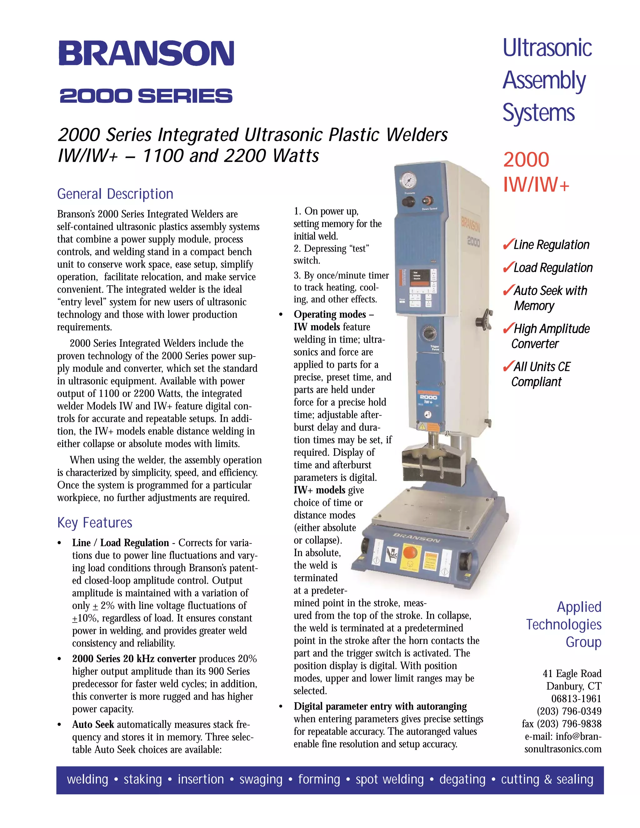 The document provides information on Branson's 2000 Series Integrated Ultrasonic Plastic Welders. Key features include digital controls for accurate setups, autotuning that stores horn frequency in memory, various operating modes, and linear ball bearing slides for smooth motion. The welders are compact and integrate the power supply, controls, and welding stand. Models include 1100W or 2200W power output and standard pneumatic controls. The welders are suitable for applications like welding, staking, and sealing of plastics.