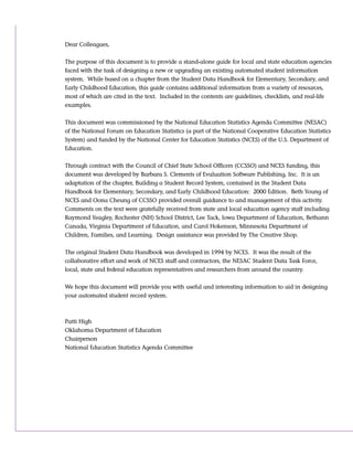 This document serves as a comprehensive guide for local and state education agencies to develop or improve automated student record systems, offering detailed steps, guidelines, and real-life examples. It emphasizes the importance of accurate and timely student data to enhance decision-making processes and educational outcomes. Funded by the National Center for Education Statistics, the guide also discusses the evolution of student records and technological advancements that facilitate better information management.