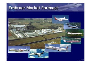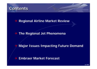 Embraer forecasts strong growth in the regional airline market over the next decade. Regional jets are becoming more widely used in the US and Europe, with passengers increasing by 5-7% annually and aircraft growing larger and flying longer routes on average. Regional jets are opening new route opportunities for airlines and replacing aging turboprops and jets. Embraer expects around 8,000 new regional aircraft deliveries over the next 10 years.