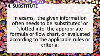 Exams require applying knowledge rather than just recalling facts. To apply knowledge, students need skills like identifying concepts, analyzing, and synthesizing. Practicing these skills is important for performing well in exams. Students should gather past exam questions and practice steps like identifying relevant information, classifying the problem type, and applying knowledge to transform the given information. Comparing answers to similar problems helps determine if the solution makes sense.