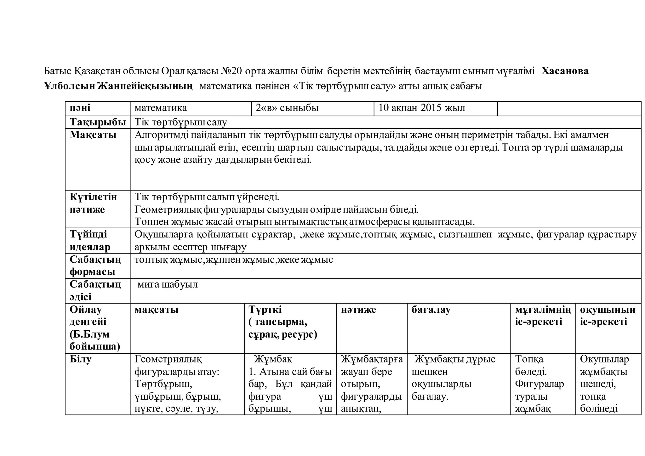 Ұлболсын Жанпейісқызының математика пәнінен «Тік төртбұрышсалу» атты ашық сабағы