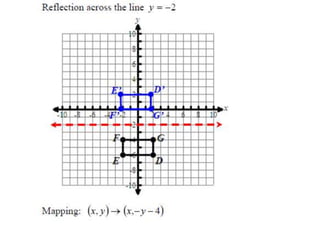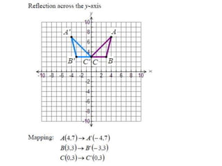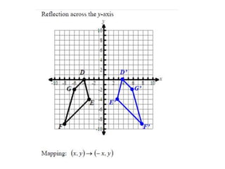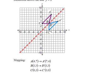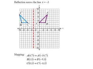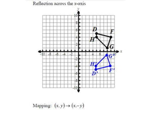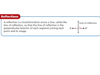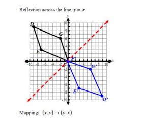 The document discusses reflections, translations, and rotations of geometric figures. It provides examples of reflecting a triangle across the x-axis, y-axis, and line y=x. It then discusses identifying reflections and translations from diagrams. Examples are given of translating a figure along a vector in the coordinate plane and rotating a triangle 180 degrees about the origin.