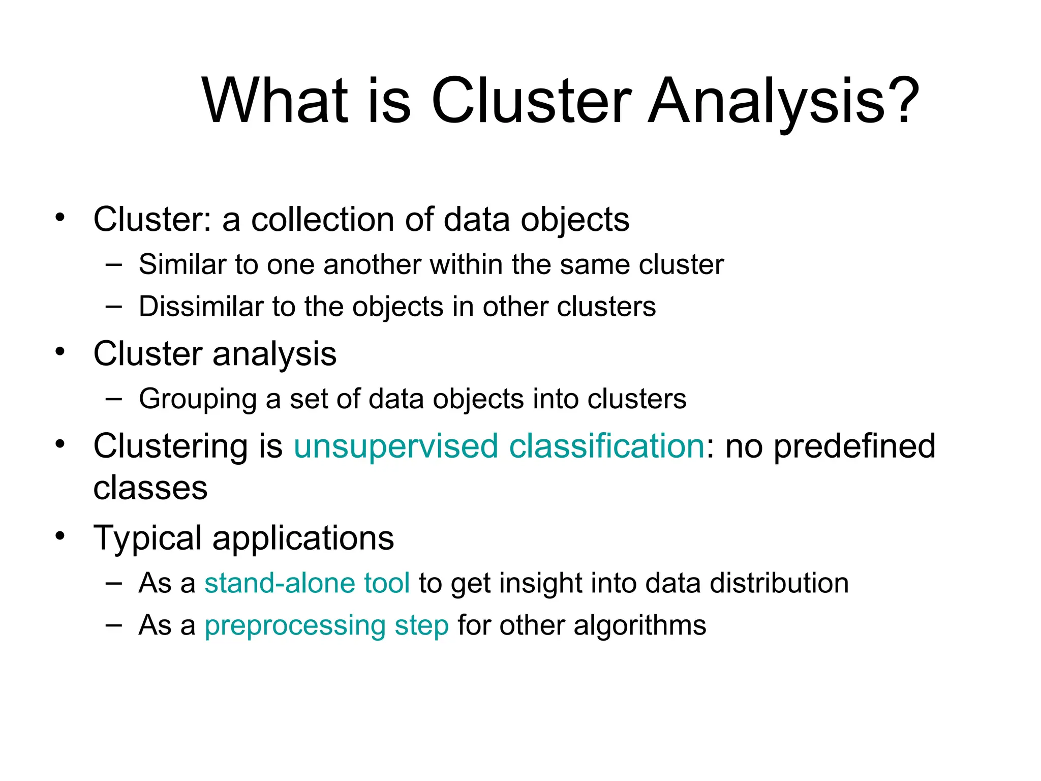 Cluster analysis is the unsupervised classification of data objects into groups (clusters) based on their similarity, with applications in marketing, land use, insurance, and city planning. Key clustering methods include partitioning algorithms like k-means and k-medoids, hierarchical techniques, and density-based approaches, each with its strengths and weaknesses. A successful clustering strategy requires quality measures, flexibility in handling various data attributes, and the ability to deal with noise and outliers.