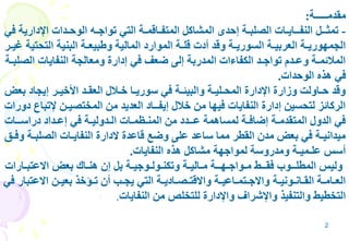تتناول الوثيقة إدارة النفايات الصلبة في الجمهورية العربية السورية، حيث تواجه البلاد تحديات عديدة في هذا المجال نتيجة لضعف الأداء والموارد المالية المحدودة. تشمل الجهود الحكومية إدخال تدريبات ودراسات لتحسين الأساليب المتبعة، بالإضافة إلى تنفيذ مشاريع مختلفة لتحسين إدارة النفايات في المدن الكبرى.