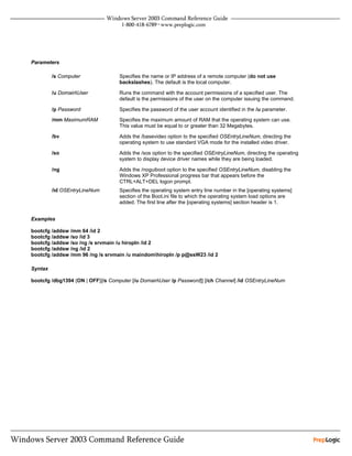 This document summarizes several Windows commands for configuring and querying boot settings and virtual memory settings. It describes the bootcfg command which allows adding, deleting, and configuring boot options. It also describes the pagefileconfig.vbs script for displaying and configuring the system's paging file virtual memory settings by querying, changing, creating, or deleting paging files.