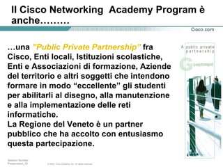 Il programma Cisco Networking Academy, in collaborazione con la Regione del Veneto, si propone di formare studenti nelle competenze IT necessarie per la progettazione e manutenzione di reti informatiche. La regione ha creato locali accademie per promuovere lo sviluppo professionale e affrontare la carenza di competenze nel settore, coinvolgendo istituzioni locali e aziende. Il progetto ha ottenuto ottimi risultati, con circa 1.500 studenti coinvolti e diverse ore di lezione erogate.