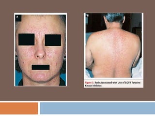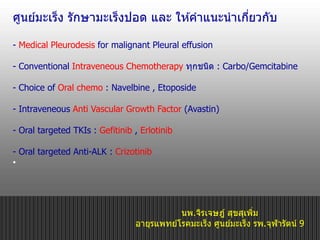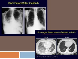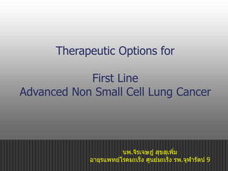 This document discusses therapeutic options for first line treatment of advanced non-small cell lung cancer (NSCLC). It provides details on chemotherapy regimens such as platinum doublets with paclitaxel, gemcitabine or docetaxel. It also discusses targeted therapies like bevacizumab, erlotinib and gefitinib. The document reviews clinical trials that established current standard first line treatments and highlights the need for personalized treatment based on tumor markers and mutations.