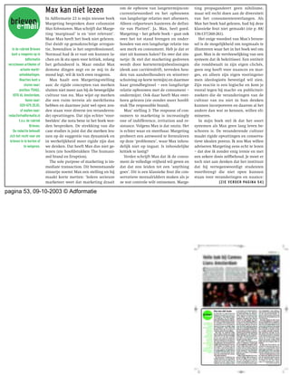 lezen om de opbouw van langetermijncon- currentievoordeel en het opbouwen ting propagandeert geen nihilisme, maar wil recht doen aan de diversiteit In Adformatie 23 is mijn nieuwe boek van langdurige relaties met afnemers. van het consumentenverlangen. Als brieven Margeting besproken door columnist Alleen colporteurs hanteren de defini- Max het boek had gelezen, had hij deze e-mail Max Kohnstamm. Max schrijft dat Marge- tie van Platteel’. Ja, Max, heel goed. klassieke fout niet gemaakt (zie p. 88/ ting ‘marginaal’ is en ‘niet relevant’. Margeting – het gehele boek – gaat ook 136-137/260-261). Maar Max heeft het boek niet gelezen. over het tot stand brengen en onder- Het enige voordeel van Max’s brouw- Dat duidt op gemakzuchtige arrogan- houden van een langdurige relatie tus- sel is de mogelijkheid om nogmaals te In de rubriek Brieven tie, bovendien is het onprofessioneel. sen merk en consument. Heb je dat er illustreren waar het in het boek wel om kunt u reageren op in Normaal had ik er vast om kunnen la- niet uit kunnen halen? En over dat zin- gaat. Max is de vervleeselijking van een Adformatie chen en ik sta open voor kritiek, zolang netje: Ik stel dat marketing gedreven systeem dat ik bekritiseer. Een entiteit verschenen artikelen of het gefundeerd is. Maar omdat Max wordt door kortetermijnbeslissingen die ronddwaalt in zijn eigen clichés, actuele markt- domme dingen zegt en ze mij in de (denk aan carrièredrift, tevreden hou- geen oog heeft voor nuances en mar- ontwikkelingen. mond legt, wil ik toch even reageren. den van aandeelhouders en winstver- ges, en alleen zijn eigen vooringeno- Reacties kunt u Max haalt een Margeting-stelling schuiving op korte termijn) en daarmee men ideologieën bevestigd wil zien. sturen naar: aan: de rigide concepten van merken haar grondbeginsel – een langdurige Zijn reactie is een logische en kom je postbus 75462, sluiten niet meer aan bij de bewegelijke relatie opbouwen met de consument – vooral tegen bij macht- en publiciteit- 1070 AL Amsterdam, cultuur van nu. Max wijst op merken ondermijnt. Ook daar heeft Max over- zoekers die de veranderingen van de faxen naar: die een ruim terrein als merkthema heen gelezen (zie oonder meer hoofd- cultuur van nu niet in hun denken 020-679.35.81, hebben en daarmee juist wel open zou- stuk The responsible brand). kunnen incorporeren en daarom al het of mailen naar: den staan voor diverse (en veranderen- Max’ stelling 3: The response of con- andere dan wat ze kennen, willen eli- redactie@adformatie.nl de) opvattingen. Dat zijn echter ‘voor- sumers to marketing is increasingly mineren. t.n.v. de rubriek beelden’ die nota bene in het boek wor- one of indifference, irritation and re- In mijn boek stel ik dat het soort Brieven. den besproken. De strekking van die sistance. Volgens Max is dat onzin. Het systemen als Max geen lang leven be- De redactie behoudt case studies is juist dat die merken leu- is echter waar en meetbaar. Margeting schoren is. De veranderende cultuur zich het recht voor om nen op de suggestie van dynamiek en probeert een antwoord te formuleren maakt rigide opvattingen en conserva- brieven in te korten of in werkelijkheid meer rigide zijn dan op deze ‘problemen’, waar Max inhou- tieve idealen poreus. Ik zou Max willen te weigeren. we denken. Dat heeft Max dus niet ge- delijk niet op ingaat. Is inhoudelijke adviseren Margeting eens echt te lezen lezen (zie hoofdstukken The humani- kritiek te lastig? – dat doe ik zonder enig ironie en met zed brand en Eruption). Verder schrijft Max dat ik de consu- een zekere dosis zelfbehoud. Je moet er The sole purpose of marketing is im- ment de volledige vrijheid wil geven en toch niet aan denken dat het instituut mediate transaction. Dit bovenstaande dat dat zou leiden tot een ‘anything dat hij vertegenwoordigt studenten zinnetje noemt Max een stelling en hij goes’. Dit is een klassieke fout die con- voortbrengt die niet open kunnen maakt korte metten: ‘Iedere serieuze servatieve moraalridders maken als je staan voor veranderingen en nuance: marketeer weet dat marketing draait ze wat controle wilt ontnemen. Marge- [Z I E V E R D E R PAG I N A 5 4 ] pagina 53, 09-10-2003 © Adformatie