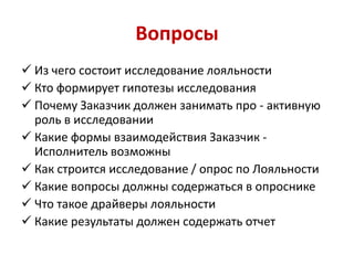 Документ обсуждает исследование лояльности персонала, охватывающее важные аспекты, такие как гипотезы исследования, роль заказчика и формы взаимодействия с исполнителем. Приводятся примеры вопросов анкеты и результаты опросов, касающиеся удовлетворенности и вовлеченности сотрудников в работу компании. Также рассматриваются драйверы лояльности и взаимосвязи между различными факторами, влияющими на готовность сотрудников работать сверхурочно.