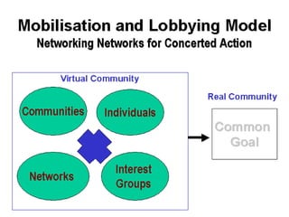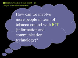 The document discusses using information and communication technology (ICT) to involve more people in tobacco control efforts. It provides examples of how different digital governance models like e-advocacy/mobilization and lobbying models have been applied to impact decision-making processes. Existing tobacco control websites and organizations in Taiwan are also listed. It raises questions about how to better utilize ICT like e-papers and websites to engage more people and fill existing gaps.