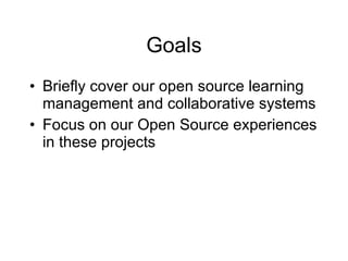 The document discusses collaboration tools developed at the University of Michigan, including the CHEF and Sakai projects. It provides an overview of the CHEF technology, features, and implementations. It then outlines the formation of the Sakai organization, which involved several universities working together on their course management systems using a shared codebase. The goal was to develop portable tools and services through an open source and standards-based collaboration between the participating universities and projects.
