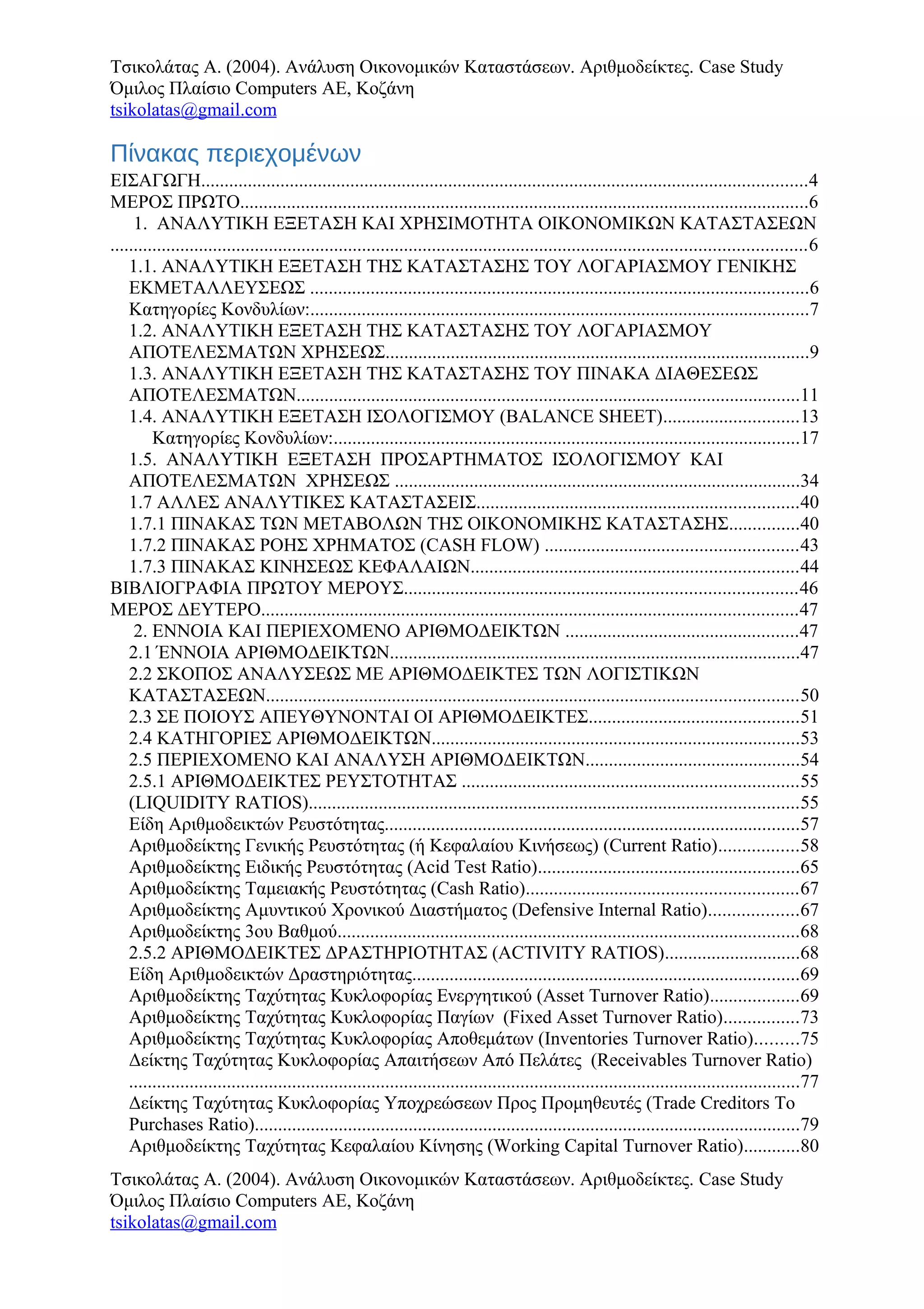 Τσικολάτας Α. (2004).Ανάλυση Οικονομικών Καταστάσεων. Αριθμοδείκτες. Case Study