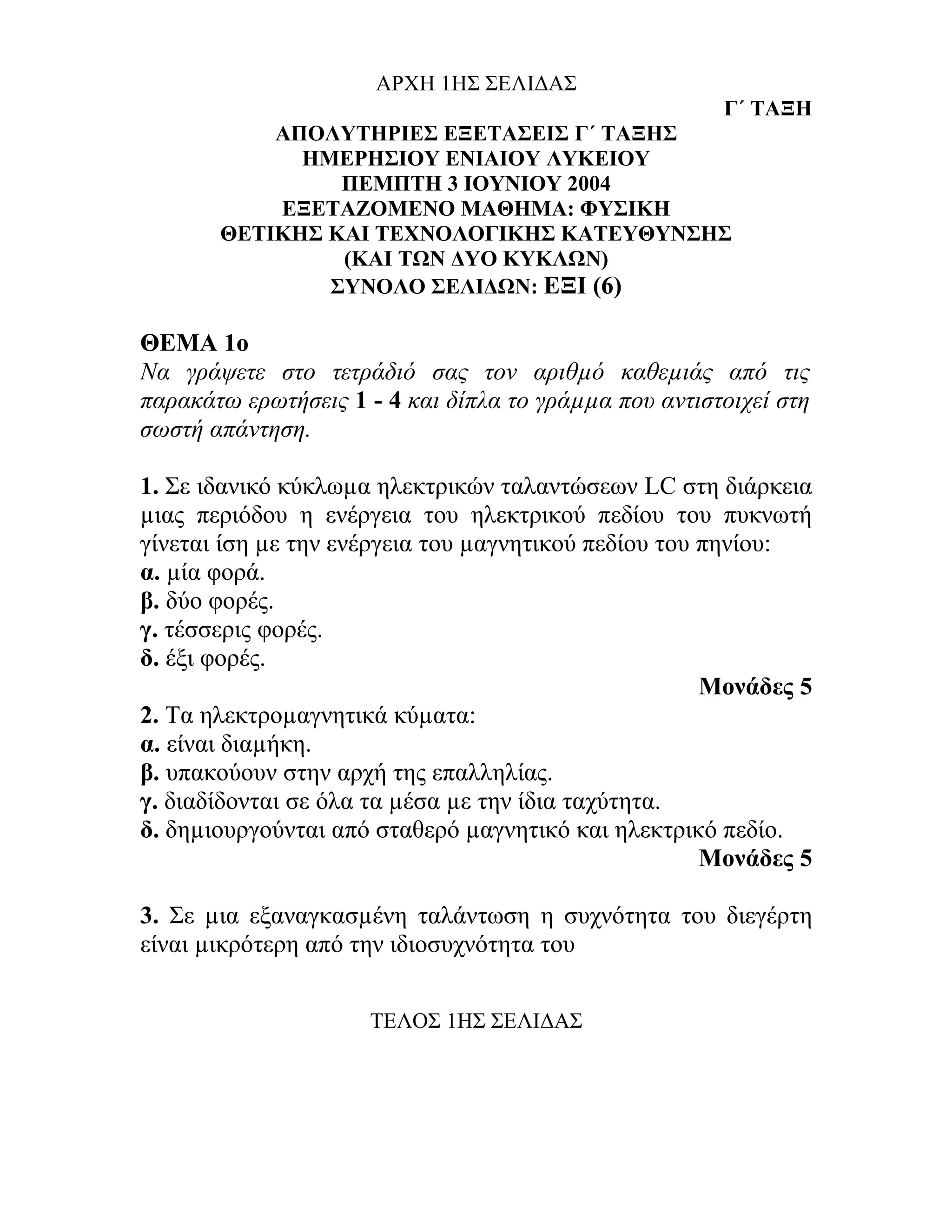 ΕΞΕΤΑΖΟΜΕΝΟ ΜΑΘΗΜΑ: ΦΥΣΙΚΗ